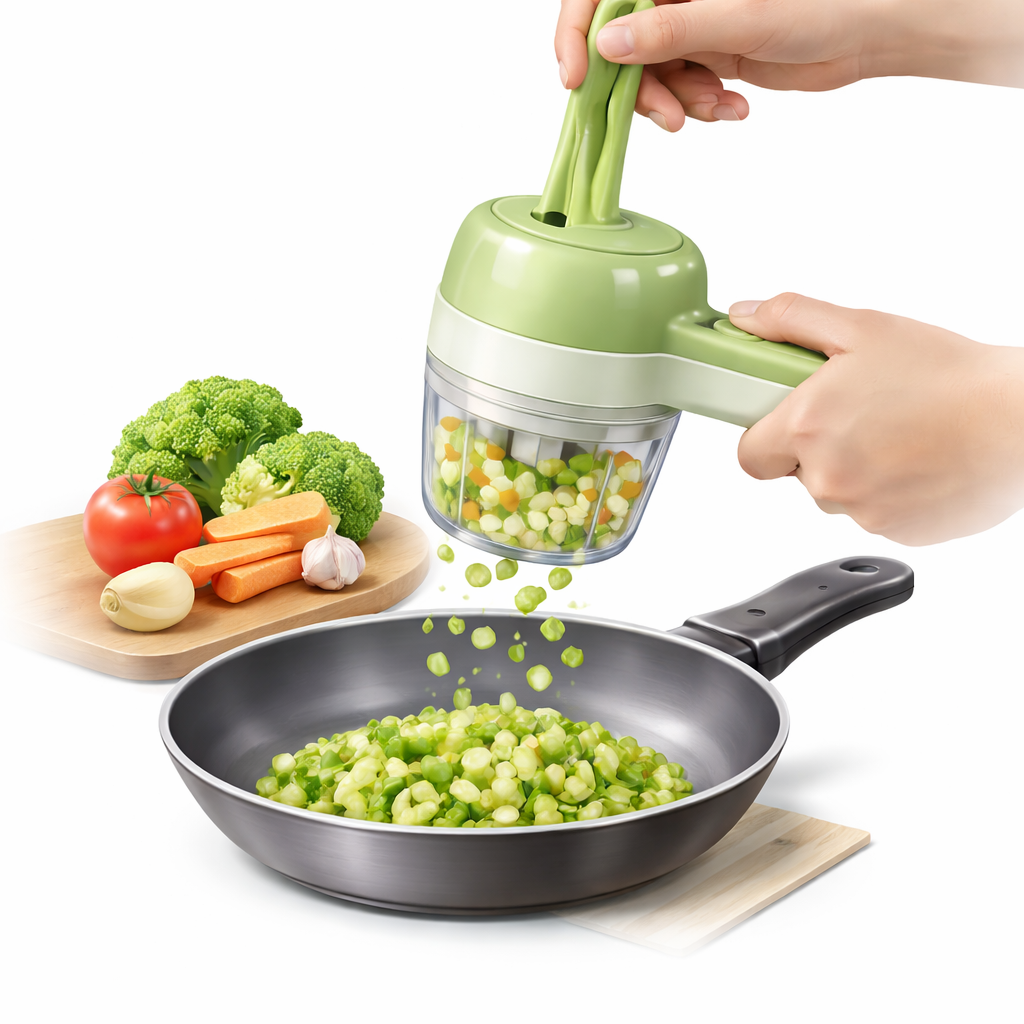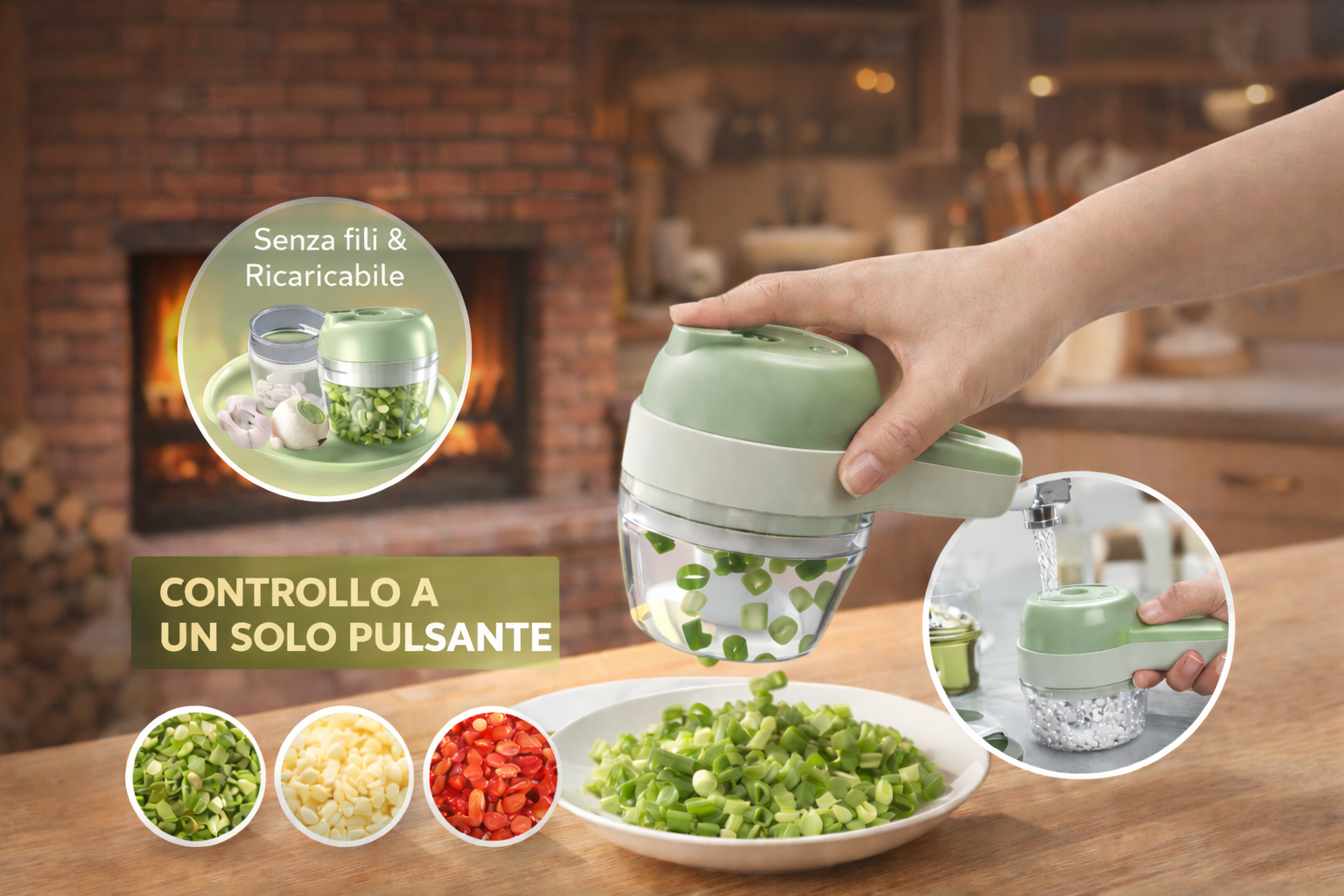 tritare, sminuzzare e preparare.Aglio, cipolla, verdure, erbe, frutta…